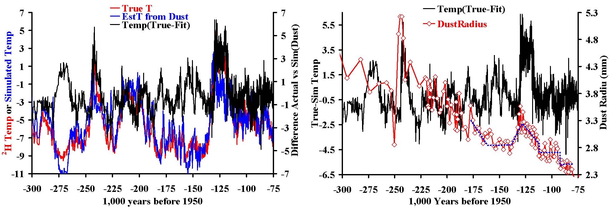 In Figure 2A, left, we show the actually temperature (red) reconstruction, simulated temperature (blue) and residuals (black), over the period 300,000 to 75,000 years ago. In Figure 2B, right, the same residual is plotted with the average radius of the dust particles, from the dust size determined by laser spectroscopy and archived by Durand, G. and J. Weiss. 2004 [9].