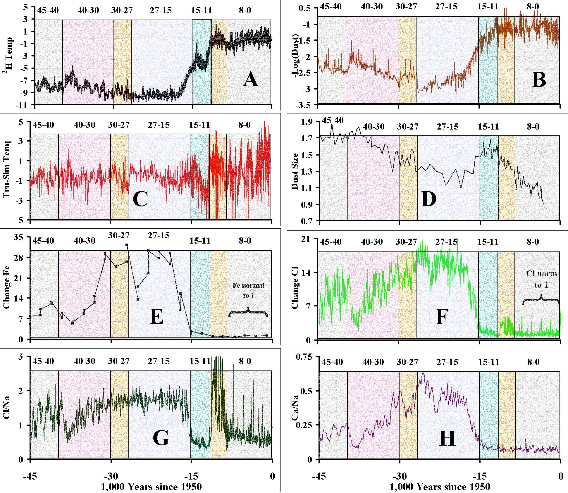Figure 3 shows eight different panels whereby changes in the deuterium derived temperature and dust levels (as -log10(Dust)), the insoluble dust radius and True Temp-Simulated Temp, the fraction changes in the levels of Fe and Cl, and finally the Cl/Na ratio and the Ca/Na ratio [the latter four elemental series from 10 and 11]. Each of the figures has been color coded to show seven different, distinct, periods; 45-40, 40-30, 30-27, 27-15, 15-11, 11-8 and 8-0 Ky.