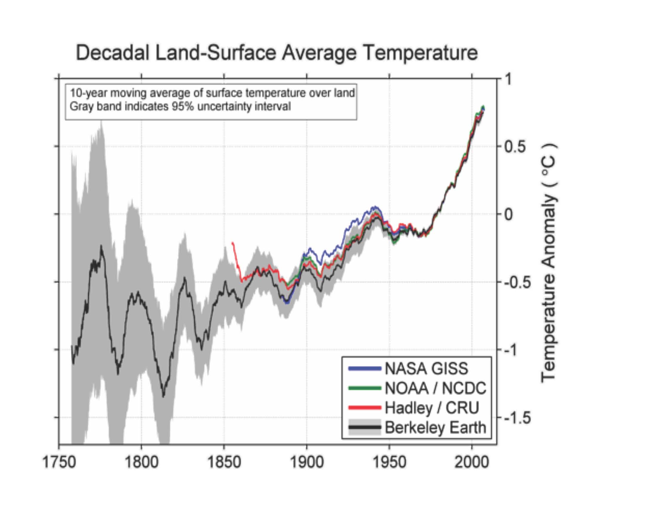 Figure 1 shows the newly released temperature data from 1750 to 2012 compared to land temperature reconstructions from NASA GIStemp, NOAA’s NCDC, and Hadley/UEA’s CRUTEM over their available records. Berkeley’s record overlaps quite well with existing records from about 1875 onwards, and includes the first ever global land temperature estimates from 1753-1850.
