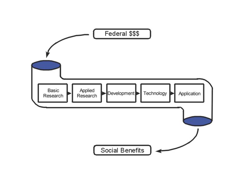 It is interesting to note that both those canons came to be captured by very simple, one dimensional graphics. The first was represented by the ever-popular idea of a spectrum of research from basic to applied. The dynamic version, the second canon of basic research, was represented by the equally popular idea of the linear model that moves from basic research to applied research via the processes of technology transfer. [The] third element in Bush’s argument is the notion that the nation will recapture the technological benefit of its investment in basic science.