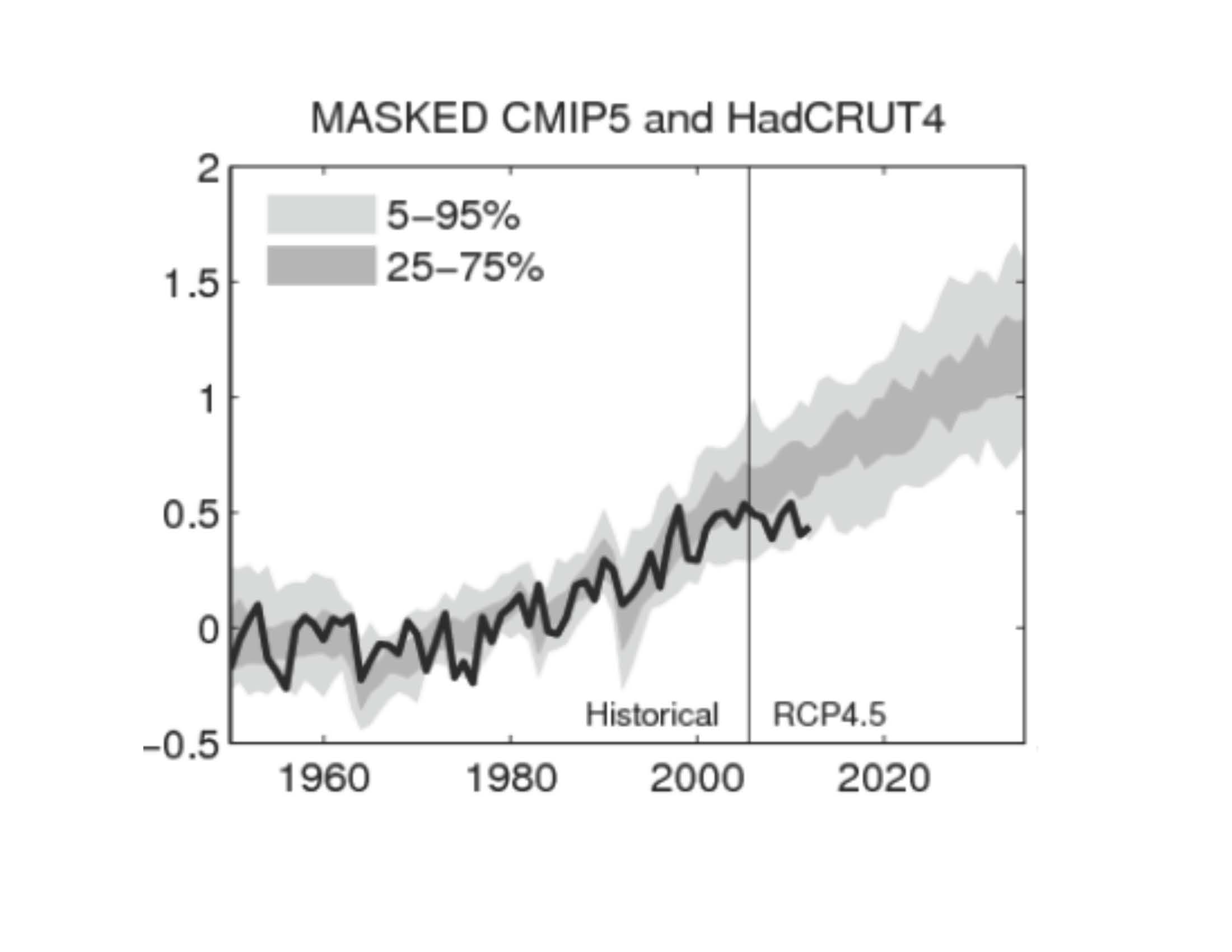 The blogosphere has really played the dominant role behind much of what is being reported by the MSM. Let me provide an example. Recall the figure prepared by Ed Hawkins, that compares CMIP5 simulations with observations: