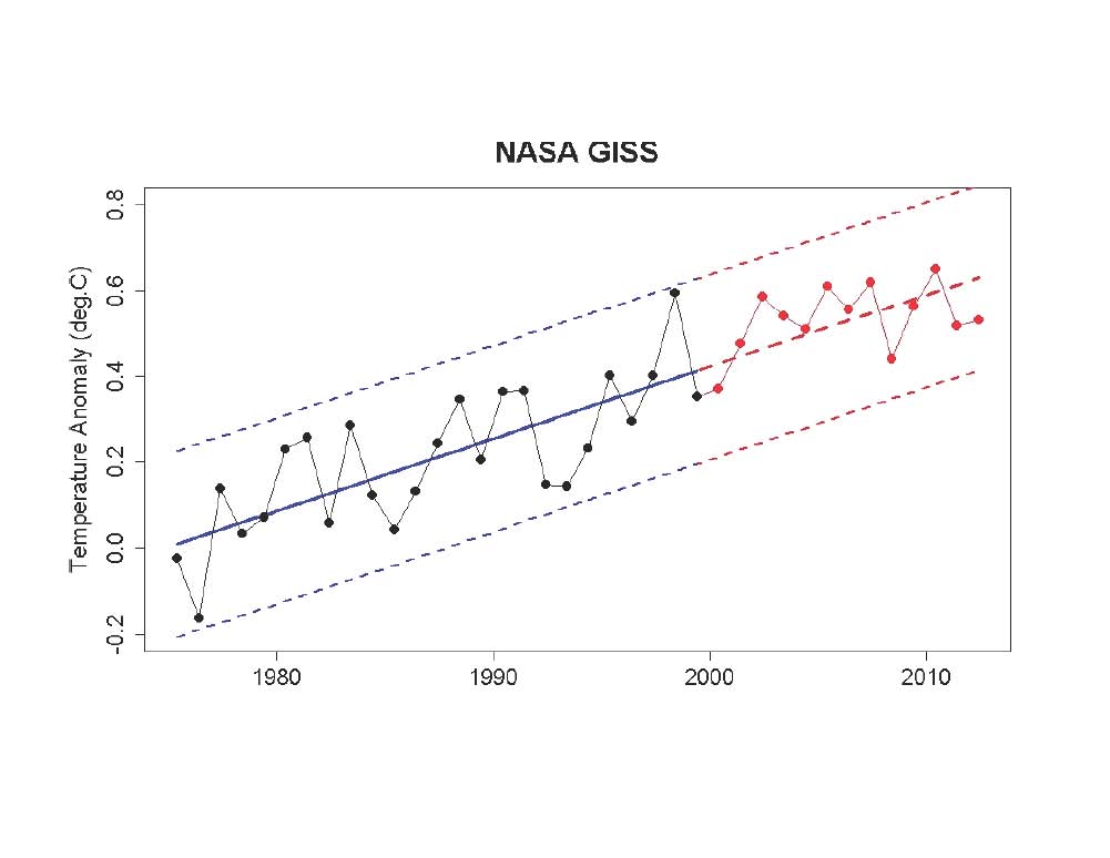 These time-series tests of “statistical significance” are of little significance. If somebody goes on a winning streak in Vegas it does no good to say that the streak is “not statistically significant” and that on average a player should lose money. The streak is a fact, just like the pause in temperature increases. Asking about statistical significance of the streak is a category error–data do not have significance levels. (The only exception is if winnings, like temperature, are measured with error and we’re worried that an apparent trend is just random measurement error. Then the “data” are really a model. No one on either side is asserting that measurement error matters in the temperature-pause case, so I’m ignoring that issue.)
