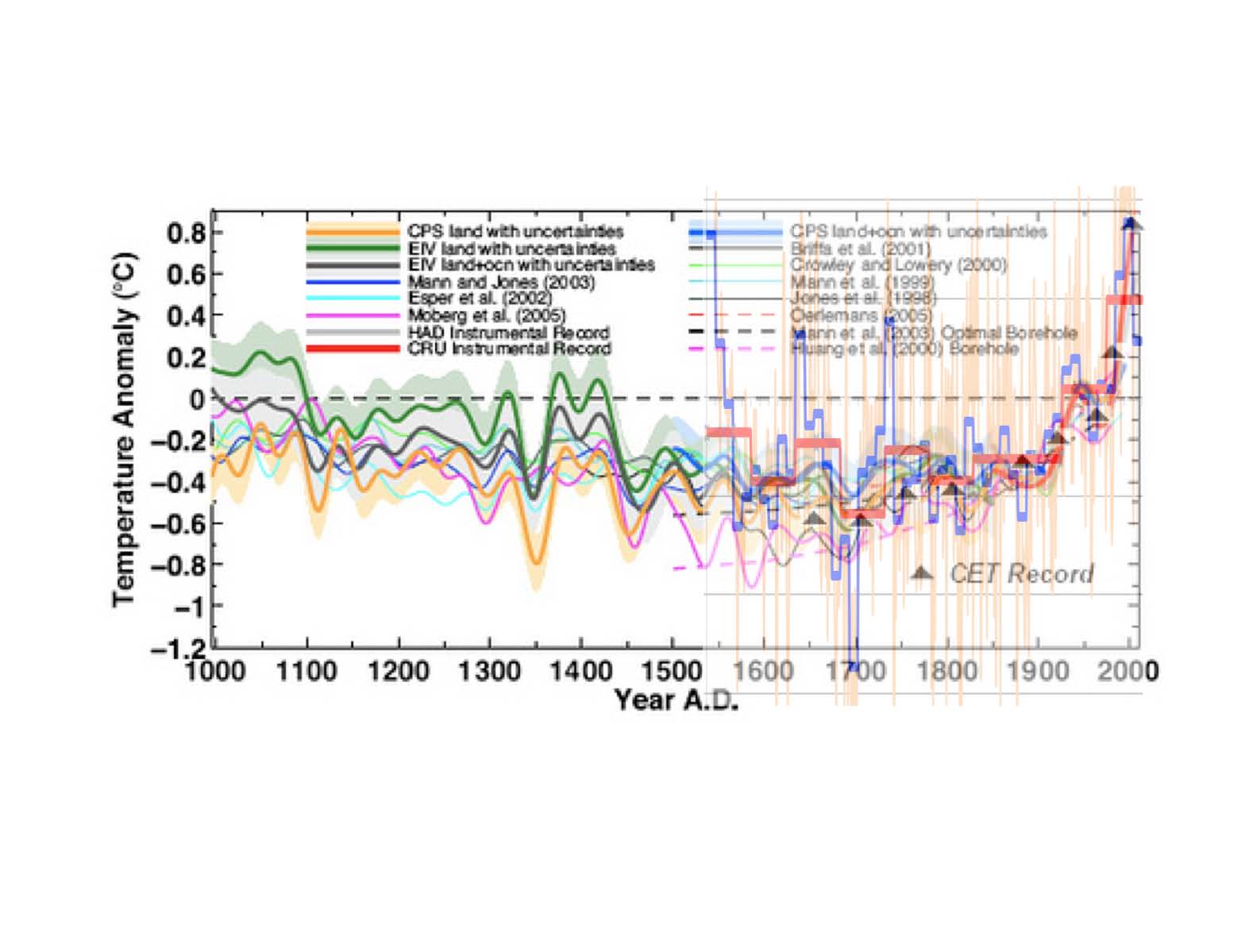 The set of modelled hemispheric temperature anomalies to the 10th century depicted below are derived from a variety of proxies including boreholes and tree rings with instrumental CET-from a third party-apparently plotted at approx. 40 year intervals.