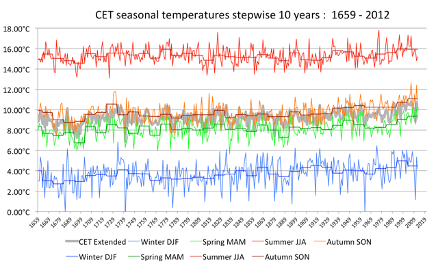However, we can say with certainty that climate changes constantly up and down and that ‘noticeable’ climate change is rather frequent throughout the record. The seasons also broadly reflect the 2C boundaries, with Winter decadal temperature ranging from 2.8 to 5C, Spring 6.8 to 9.3C, Autumn 9 to 11.2C; however, Summer shows a much smaller decadal range between 14.8 to 16C, which brings the overall average seasonal range back to the overall 2 degree C boundary. The seasonal CET to 1659 is shown below.