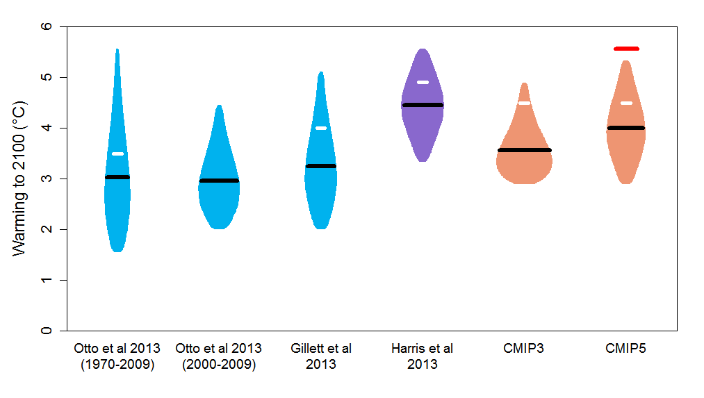 Moreover, the Met Office Report does not reveal that the warming at 2100 shown for Otto et al is based on its TCR estimates using data for 1970–2009 rather than its primary, arguably more reliable, TCR estimates based on data for the 2000s. Using those estimates instead, the median 2100 warming estimate from Otto et al under the RCP8.5 scenario becomes 2.9°C, with a 5–95% range of 2.0–4.4°C. Both the median estimate and the top of the 95% range are substantially lower than the figures of respectively 3.5°C and 6.2°C given in Figure 2 of the Report. Note that the statement in the caption thereto that medians are marked is incorrect for 3 out of 5 sources; it is means that are marked, except for Otto et al and Harris et al 2013.