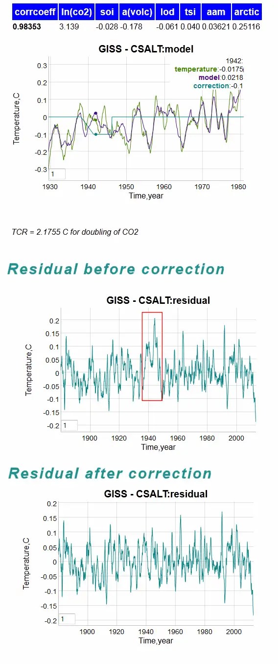 LOL, Cappy, The correction is rather puny — 0.1C over the course of the war years — enabling the CSALT model to reach an R value of 0.99 over the span of 130+ years of GISS data.