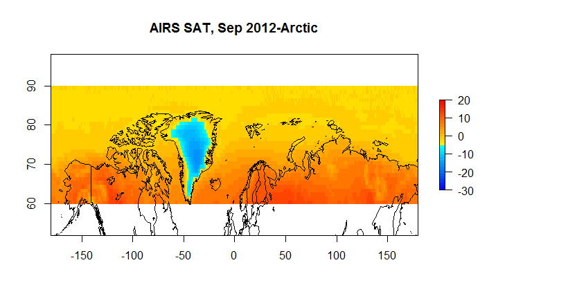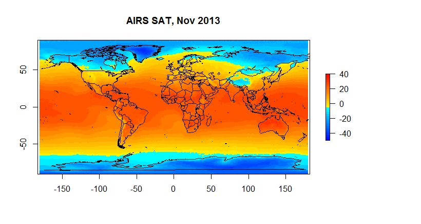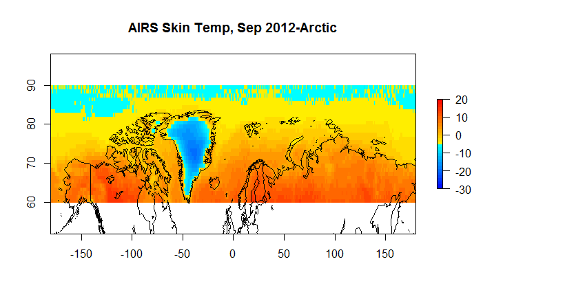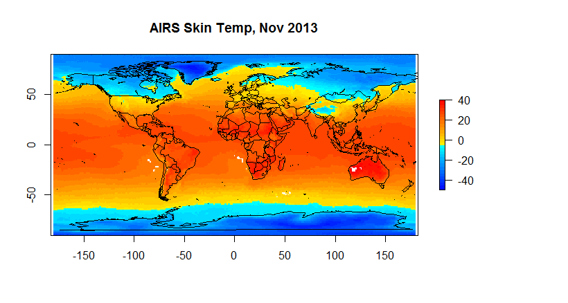 The dataset I’ve selected is AIRS Version 6, level 3 data. In particular I’ve selected a few interesting files from the over 700 climate data files that sensor delivers. I selected AIRS primarily because of an interesting conversation I had with one of the PIs at AGU and because it allowed me to do some end user testing for the gdalUtils package for R. So this is exploratory work in progress. For the first pass at the data I’ve looked at AIRS skin surface temperature, surface air temperatures, and temperatures at 1000,925,850,700 and 600 hPA. There is more data, but I’ve started with this.