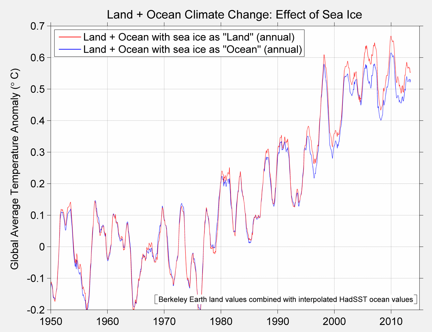 I parse this description finely because we face a choice when constructing the global temperature index: what do you do about ice, especially in light of the fact that the area covered by ice changes with time? In our approach we looked at two ways of handling that issue. For areas at the poles where there is changing ice cover we consider using the temperature of water under the ice, and we consider using the air temperature over the ice. As an index, of course, you could use either as long as you did so consistently. Our preferred method looks at the air temperature over ice and the “Alternative” method uses SST under ice as the values for those grids. When and where ice is present we proscribe -1.8C for the SST under the ice. The freezing point of sea water varies depending on local salinity of the water. A range of salinity values typical for the polar regions implies a freezing point range of -1.7 to -2.0 C. We proscribe this as -1.8 C in our treatment, corresponding to a salinity of about 33 psu. The Arctic is mostly less saline that this (except in the deep water formation region) while the Antarctic is mostly more saline than this. The difference between our baseline case where estimate the temperature of air over ice and our alternative case where we proscribe SST under ice is instructive. That is one of the motivations behind the exercise. You should view this as a sensitivity exercise to judge the impact of different methodological choices. Note, that if an area is always covered by ice, it will have zero trend in the proscribed SST.
