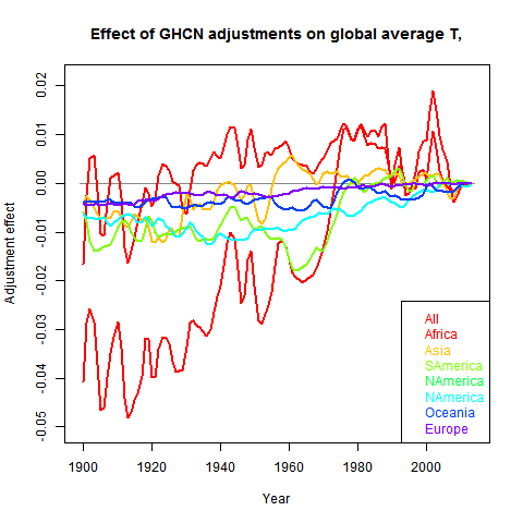 As the black trace in the upper panel shows the impact of all adjustments (Adjusted-NonAdjusted) is effectively zero back to 1900. And prior to that the adjustments cool the record slightly. However, we can also see that the adjustments have different effects depending on the continent you choose. Africa, which has 20% of the land area of the globe has adjustments which cool it from 1960 today. While the US, (around 5% of all land) has adjustments which warm its record.
