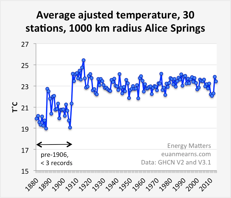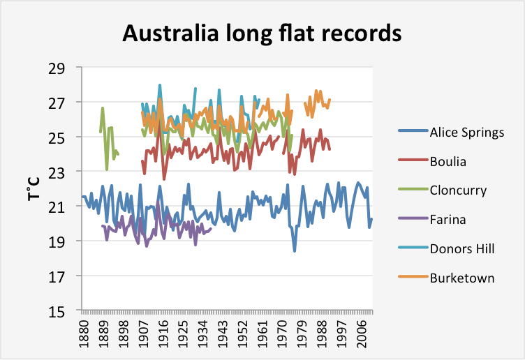 - In Alice Springs the raw record is flat and has no sign of warming. In the adjusted record, homogenistaion has added warming by significantly cooling the past. Five other stations inside the 1000 km ring have similarly long and similarly flat records – Boulia, Cloncurry, Farina, Burketown and Donors Hill. There can be no conceivable reason to presume that the flat raw Alice Springs record is somehow false and in need of adjustment.