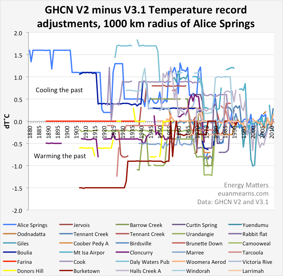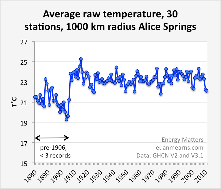 - A comparison of raw temperature records (GHCN V2) and homogenised temperature records (adjusted records GHCN v3.1) is presented for 30 climate stations (Figure 2) within a 1000 km radius of Alice Springs, Australia. The adjusted records are subtracted from the raw records which illustrates the degree of adjustment for each station.