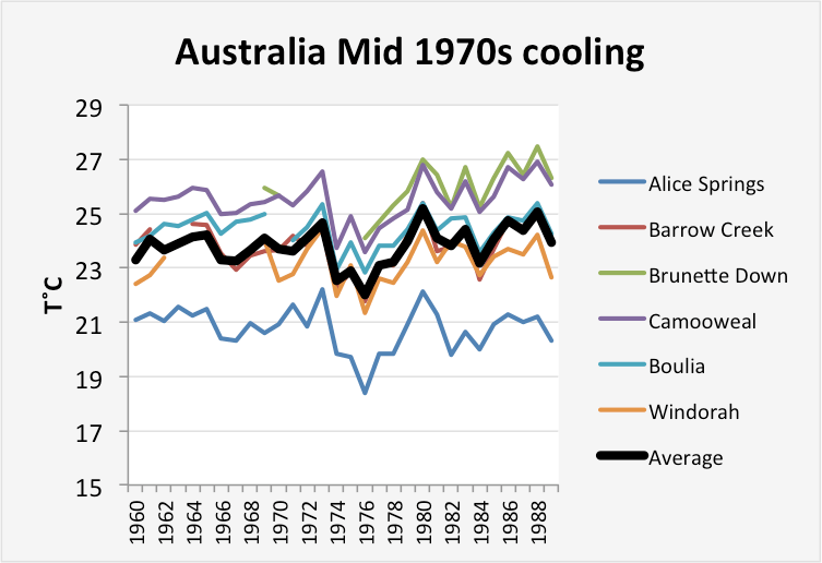 - Six records show a significant mid-1970s cooling of about 3˚C (Alice Springs, Barrow Creek, Brunette Down, Cammoo Weal, Boulia and Windorah) that owing to its consistency appears to be a real signal. Homegisation has tended to remove this real temperature history.