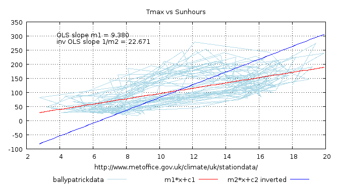 Figure 1 showing conventional and inverse ‘ordinary least squares’ fits to some real, observed climate variables.