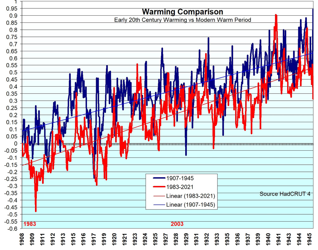 Further, the period of warming 1910-1945 was as fast as in the period 1976-current, without much help of CO2. What caused that and what caused the slight cooling 1946-1975 with increasing CO2?
