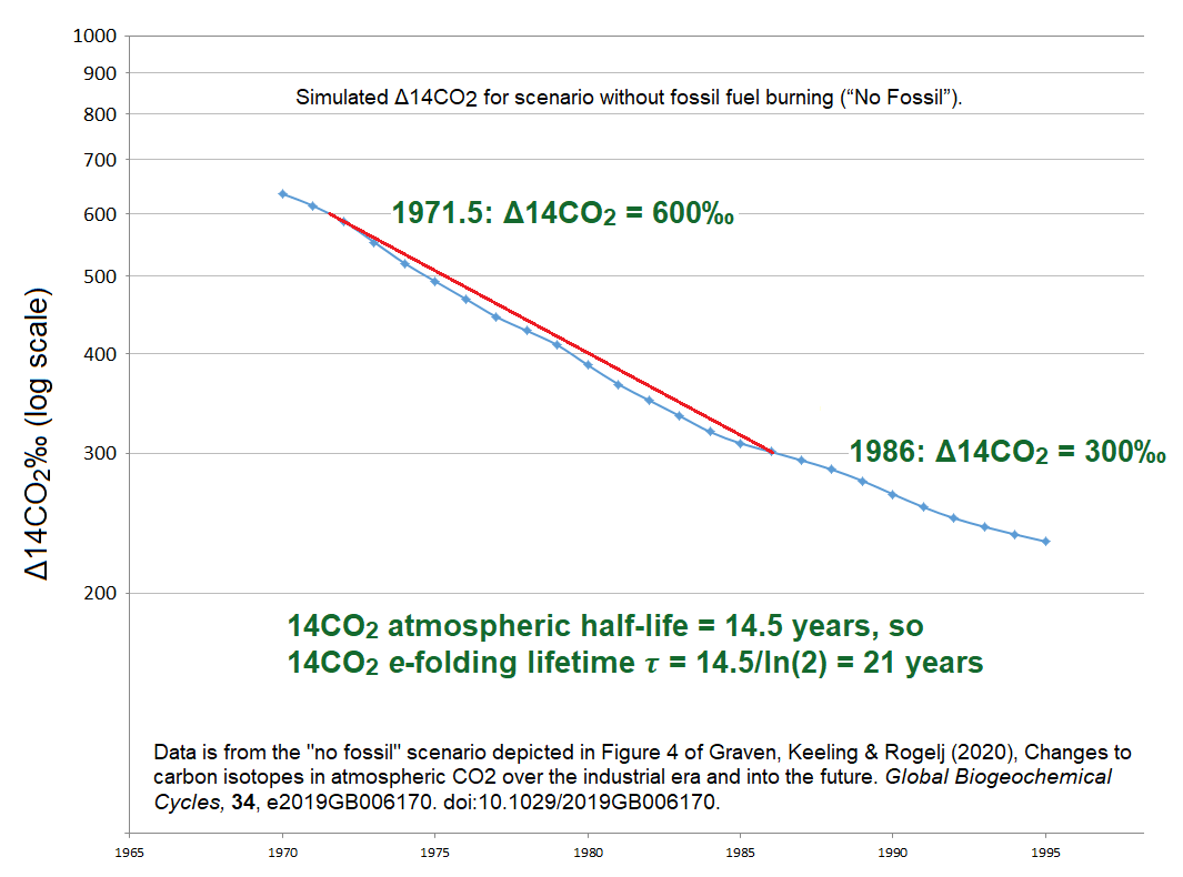 An important question is whether we have any indication that this rather high absorption rate can be justified by measurements. Due to the nuclear bomb tests in the 1950s, which stopped in 1963, we have a close-to-ideal identifiable carbon emission pulse that has been thoroughly investigated for more than 40 years. The resulting decreasing atmospheric 14𝐶-concentration shows, over a 30-year time period, that the contributing absorption sink processes exhibit an undistorted exponential decay of a first order linear differential equation. The decay time of the resulting concentration curve has been determined to be 15 years, implying a yearly downwelling rate of 1/15≈6.7%. Although a small part (<0.5%/year) of the 14𝐶 concentration reduction in the atmosphere is due to the dilution effect of concentration increase through anthropogenic emissions, this indeed confirms that a yearly absorption rate of 4.36% is plausible.